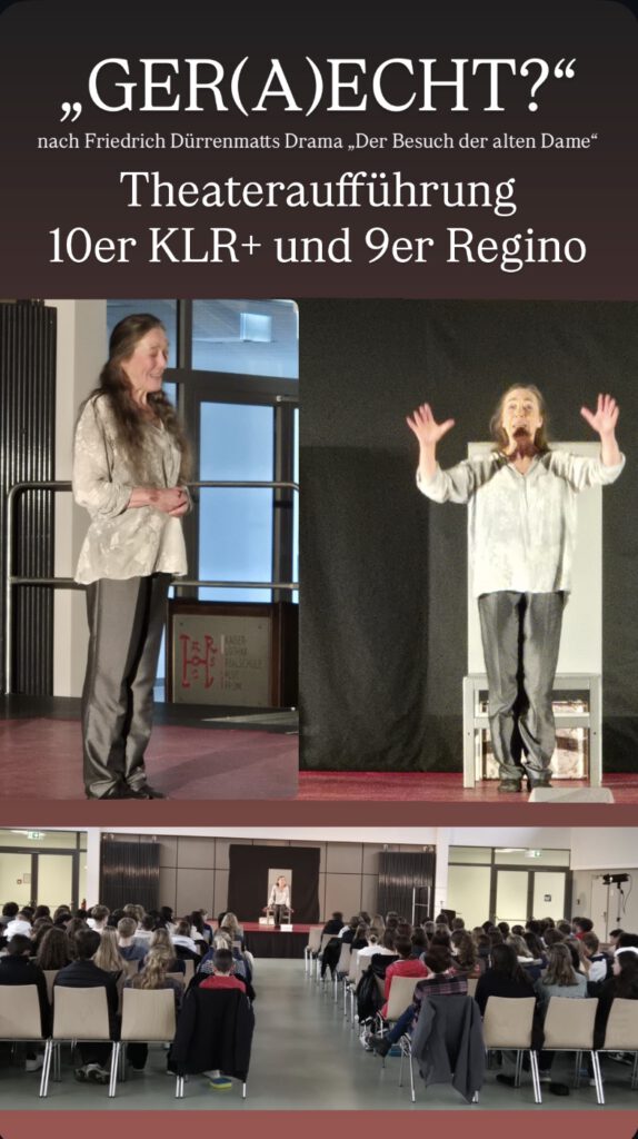 Auch in diesem Schuljahr gastierte das „Knirpstheater“ in der Aula der Kaiser-Lothar-Realschule plus in Prüm. Astrid Sacher führte auf der dortigen Bühne für die Jahrgangsstufe 10 der Kaiser-Lothar-Realschule plus sowie die 9er des Regino-Gymnasiums eine Adaption von Friedrich Dürrenmatts Drama „Der Besuch der alten Dame“ auf. Die erfahrene Schauspielerin zog die Schülerinnen und Schüler von Beginn an in ihren Bann. Konzentriert und beeindruckt verfolgte das Publikum das Schicksal von Claire Zachanassian, die einst als schwangere Siebzehnjährige von ihrem Freund Ill verleugnet und schließlich von der gesamten Dorfgemeinschaft Güllen verstoßen wurde. Nun kehrt sie als reiche Frau nach Güllen zurück, um sich zu rächen, „die Welt zum Bordell“ zu machen und so „Gerechtigkeit“ zu erhalten. Unter der Bedingung, dass Ill getötet wird, erhalten die Güllener durch Claires große finanzielle Unterstützung die Möglichkeit, ihr heruntergekommenes Dorf wirtschaftlich neu zu beleben. Nach anfänglicher Entrüstung über dieses unmoralische Angebot siegt unter dem Deckmantel der vermeintlich gerechten Strafe für das Vergehen in der Vergangenheit letztendlich doch die Gier, sodass das ganze Dorf nach einer einstimmigen Abstimmung mitsamt seinen „Würdenträgern“ den gemeinschaftlichen Mord an Ill begeht.