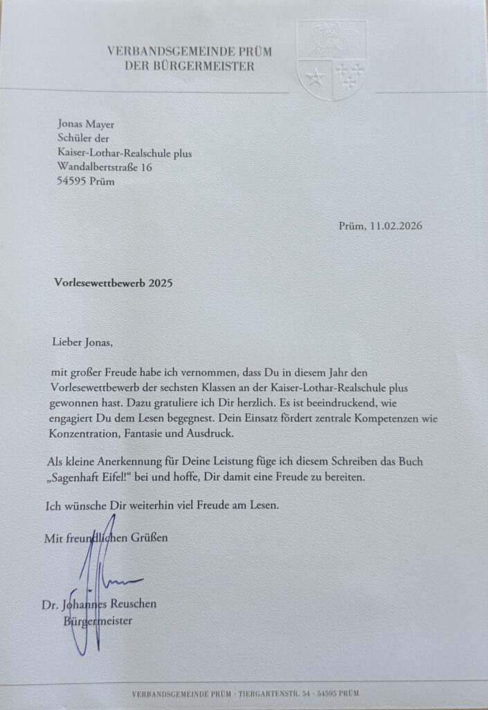 Auch in diesem Jahr nahm die Kaiser-Lothar-Realschule plus Prüm beim 67. Vorlesewettbewerb für die Klassenstufe 6 teil. Der Vorlesewettbewerb des Deutschen Buchhandels steht unter der Schirmherrschaft des Bundespräsidenten und zählt zu den größten bundesweiten Schülerwettbewerben. Alle Schüler durften teilnehmen und eine Stelle aus dem Lieblingsbuch vorlesen. Die besten Leser traten im Finale, bei dem ein Wahl- und ein Fremdtext vorgelesen wurden, gegeneinander an. „Dabei kam es auf eine nachvollziehbare Textstellenauswahl, die Lesetechnik sowie die passende Betonung und einen lebendigen Vortrag an“, erklärten Yvonne Jagoda und Janine Bujara (Fachkonferenzleitung Deutsch) die Bewertungskriterien. Die aktuellen 5er-Klassen durften als Zuschauer in der Schulbücherei ebenfalls dabei sein und haben gespannt zugehört.