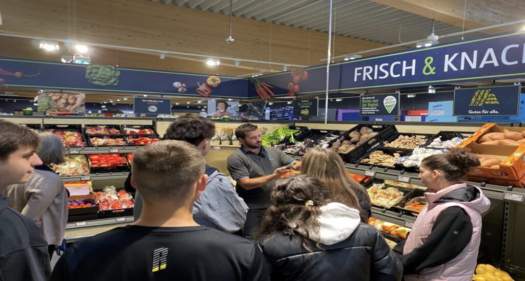 Bei einem aus­führ­li­chen Laden­rund­gang erklär­te der­stell­ver­tre­ten­de Fili­al­lei­ter Sebas­ti­an Ses­ter­heim von Pidoll, die Tätig­keits­be­rei­che in der Filia­le. Was genau ist eine Los­num­mer und was hat die Obst und Gemü­se Qua­li­tät damit zu tun. Wie funk­tio­nie­ren elek­tro­ni­sche Preis­schil­der und ein auto­ma­ti­sches Bestell­sys­tem und wie hän­gen PLU-Num­mern­da­mit zusammen.
